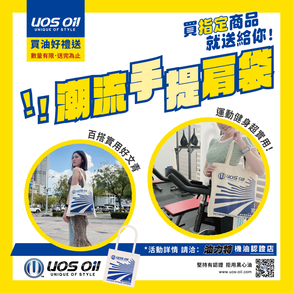 全新活動開跑! 任買三罐UOS機油 就送【UOS OIL 潮流手提肩袋】一個!